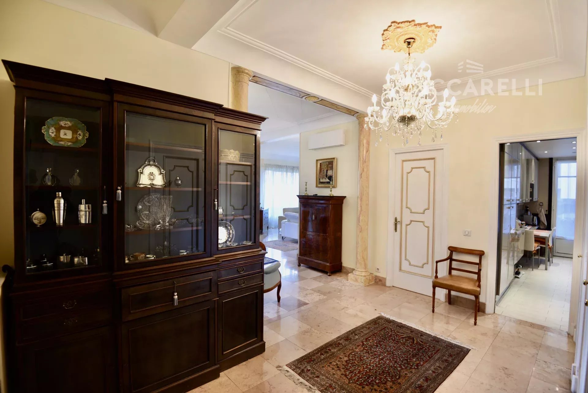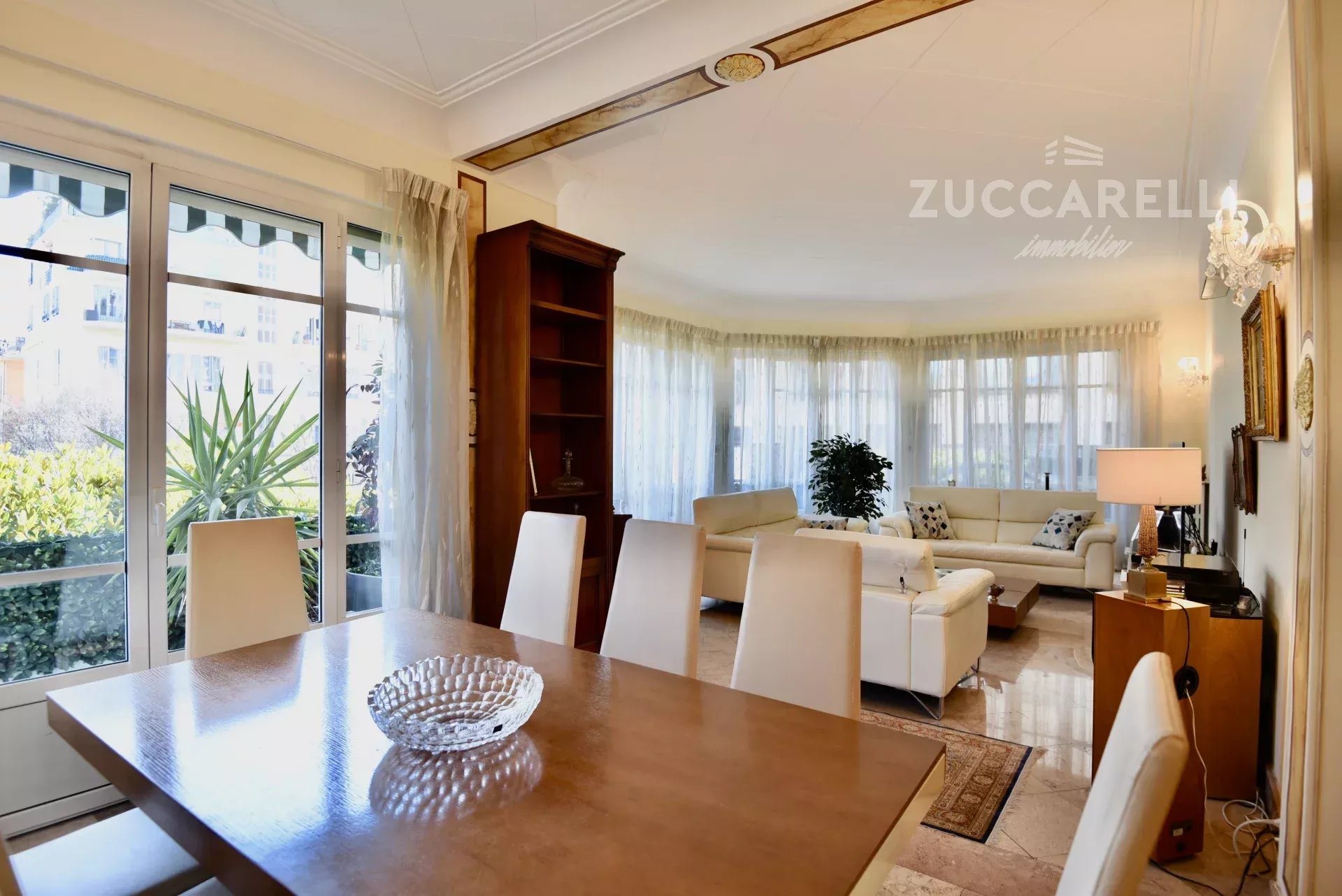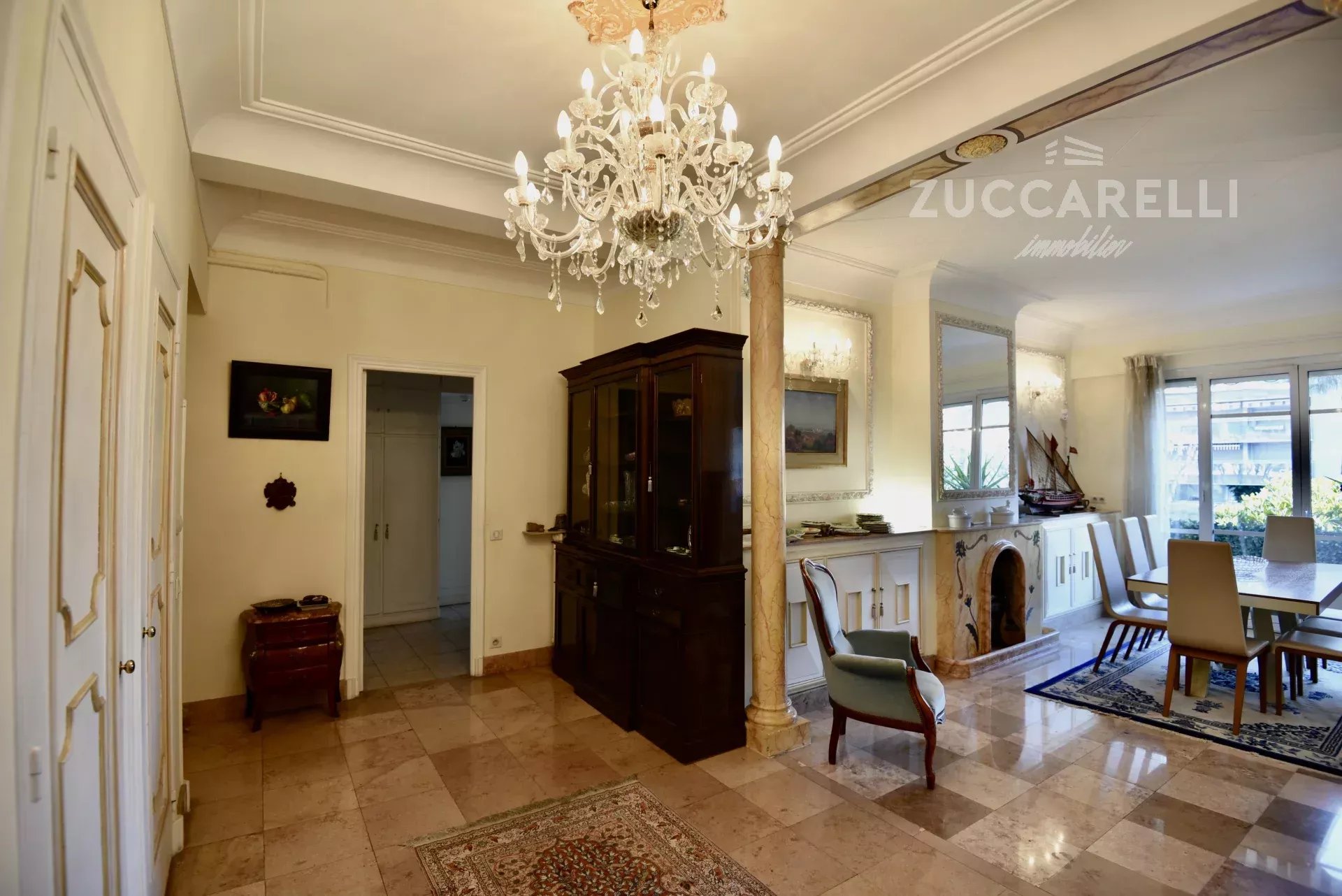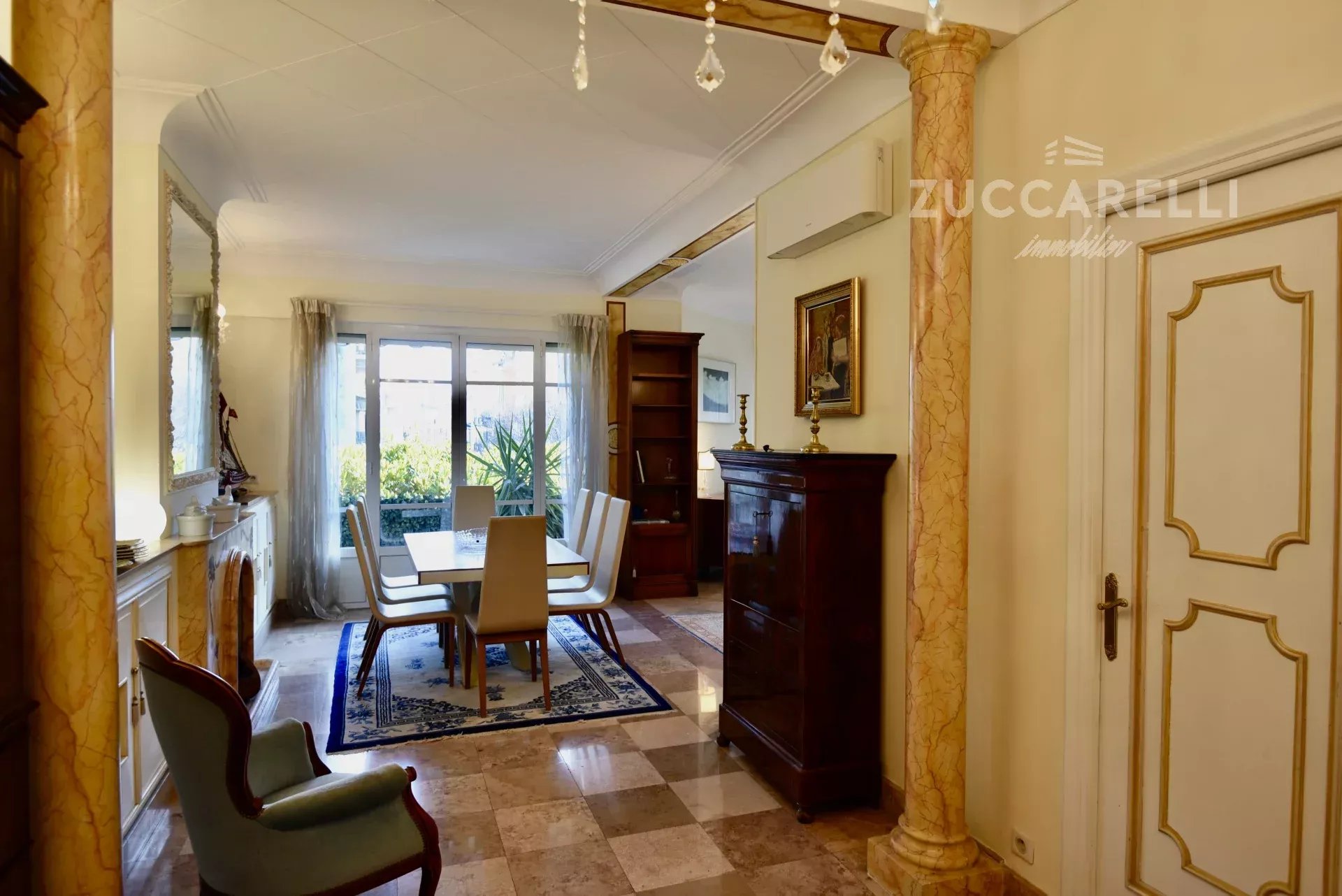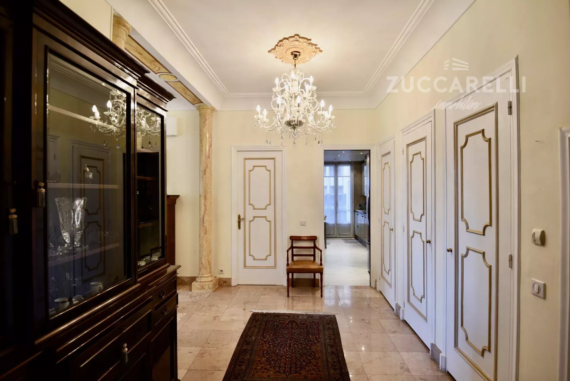 Cet appartement de type 4 pièces, d’une superficie habitable de 130 m², s’ouvre sur un grand hall d’entrée menant à une superbe pièce de vie, salon et salle à manger, baignée de lumière. L'ensemble se distingue par une hauteur sous plafond de 3 mètres, d'un sol en marbre, de belles moulures et d'une belle terrasse exposée plein sud, garantissant une luminosité idéale tout au long de la journée.